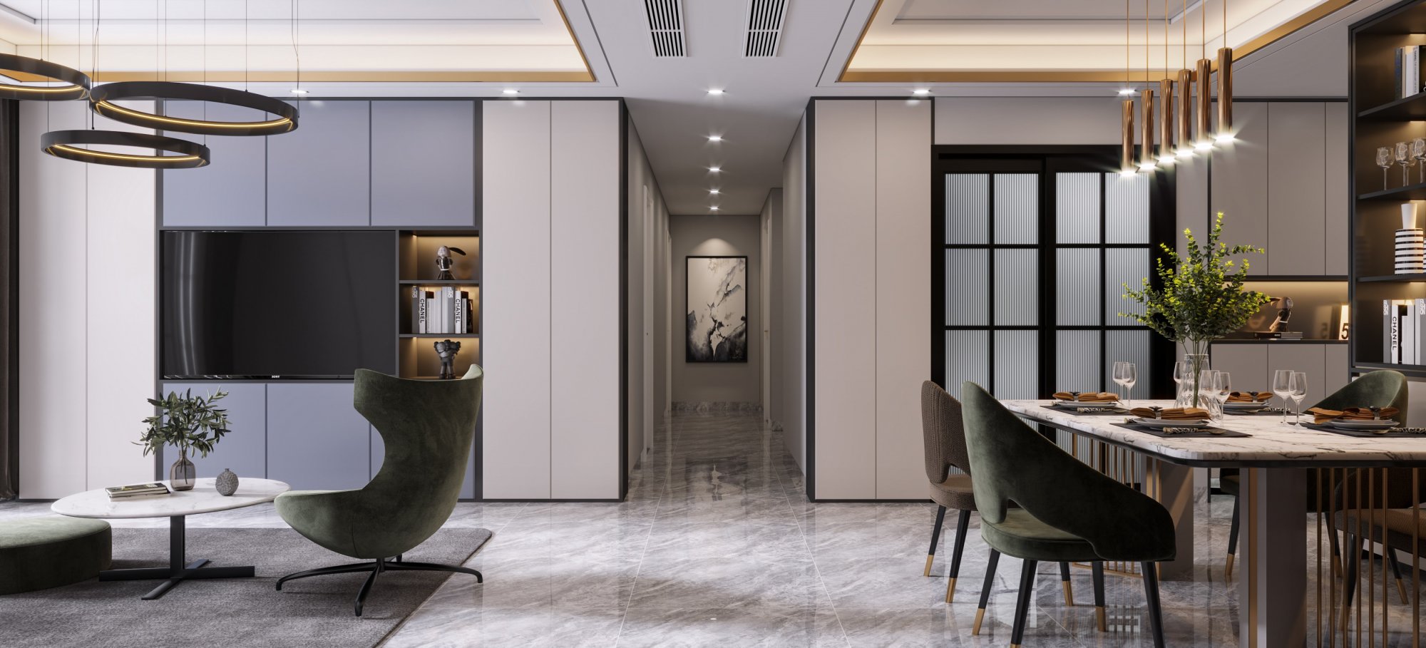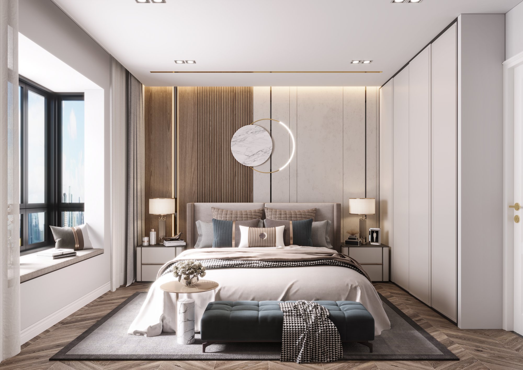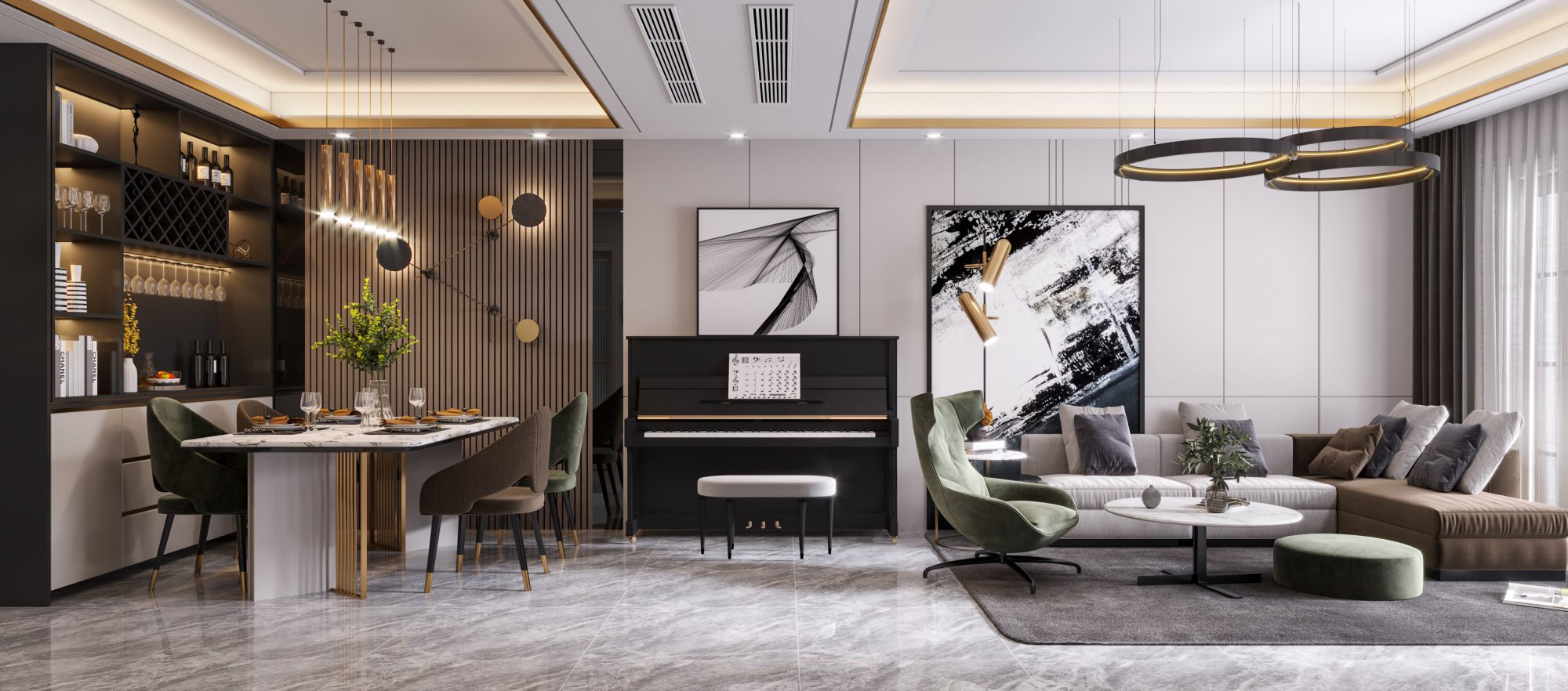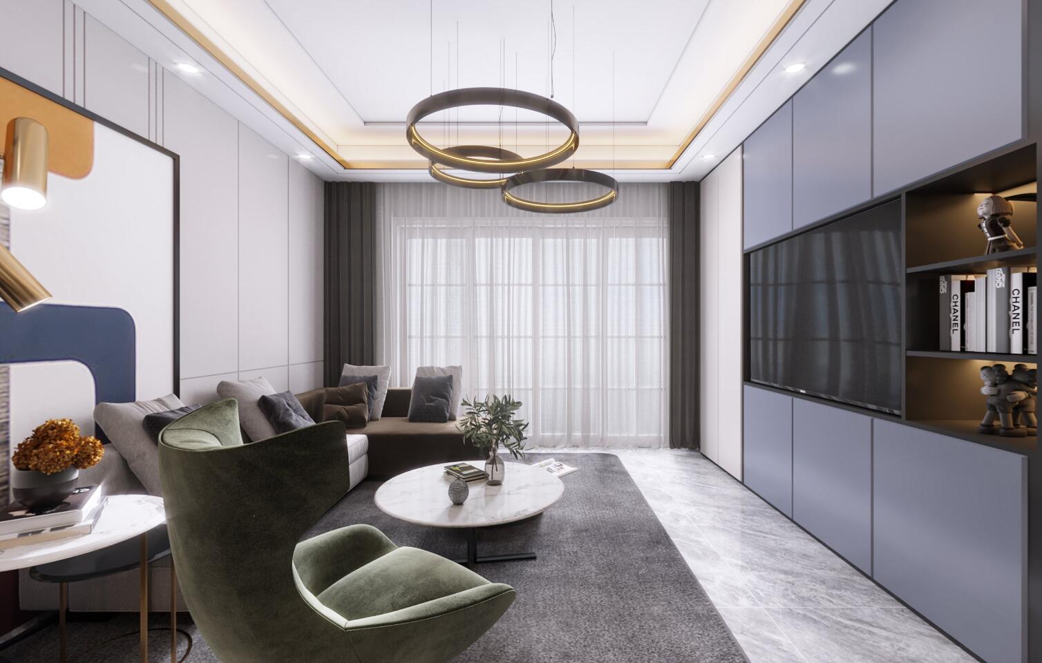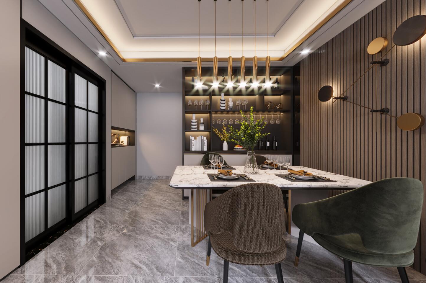 深色調(diào)的現(xiàn)代風(fēng),在頂部燈光的營造下溫柔舒適!